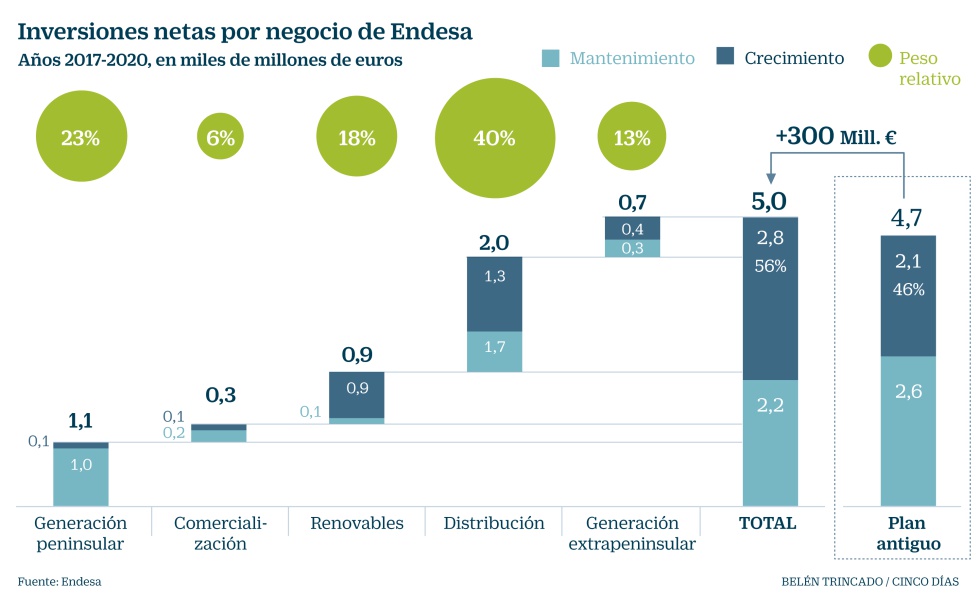 Endesa presentó ayer la revisión de su plan estratégico (2017-2020) en el que figuran unas inversiones de 5.000 millones de euros, 300 millones más de los previstos el año pasado, de los cuales, más de la mitad para crecimiento. La eléctrica española controlada por Enel, desvela en la información remitida a la CNMV que, de esa cantidad, 300 millones se destinarán “a adaptar el carbón a las mejores prácticas medioambientales”. Concretamente, en sus centrales de Litoral, en Carboneras (Almería) As Pontes (A Coruña), que funcionan con mineral de importación.